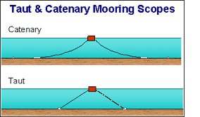 TTI defines a taut leg as one where the line rises from the anchor under normal pretension, so there is no grounded line to lift off the seabed as line tension increases. Because of this, taut moorings work in a fundamentally different way to catenary moorings, their compliance deriving mainly from the elastic stretch of the lines, whereas a catenary mooring derives its compliance from the change in suspended line weight.